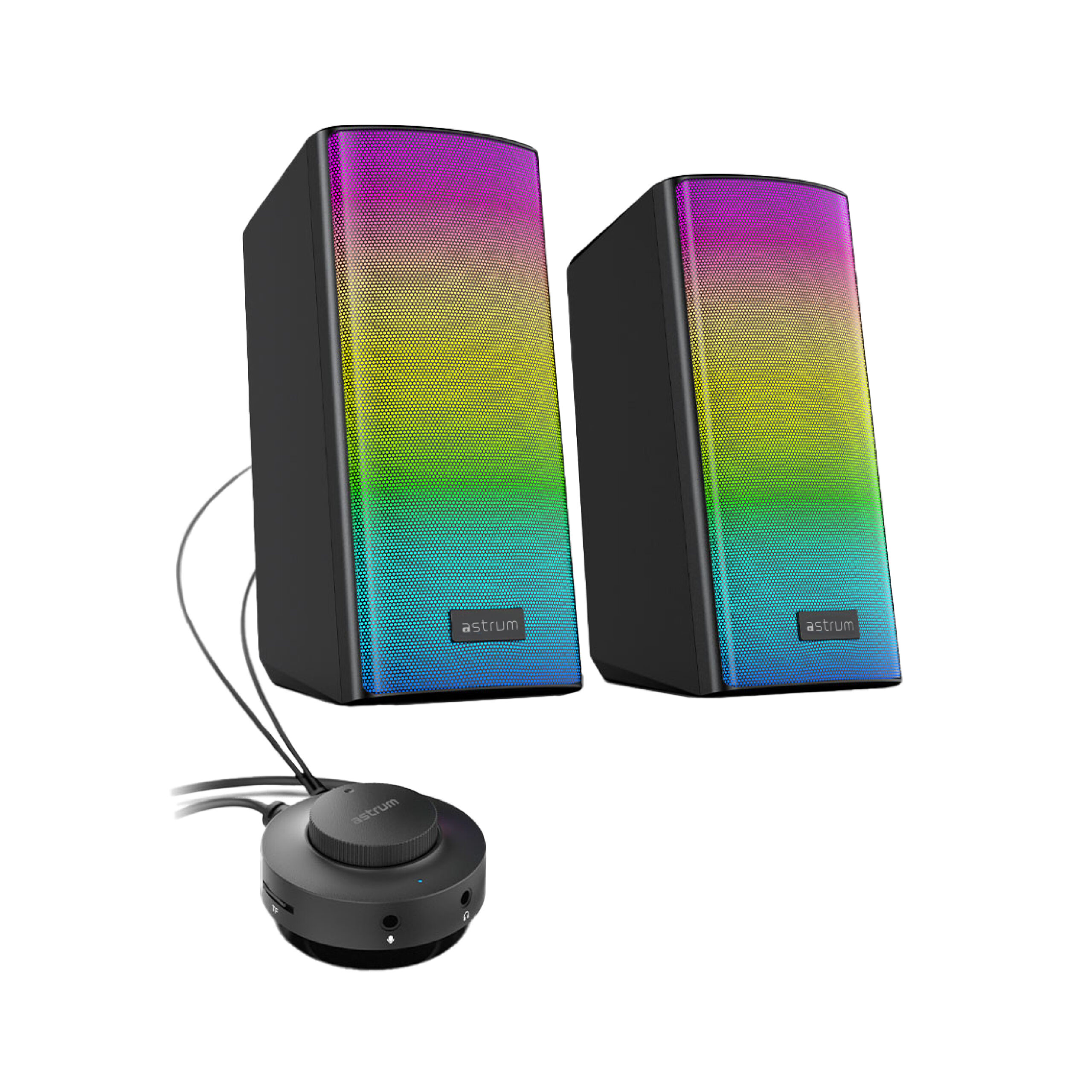 Premium Crafted, these high-quality speakers draw power seamlessly from a USB connection, ensuring compatibility with any device featuring a standard 3.5mm headphone jack-be it a desktop, laptop, phone, tablet, monitor, or TV. Be in control with the easy-to-reach wired knob for seamless and easy volume control, which also features 3.5mm Aux Inputs jacks for the microphone and headphones in case you want to be more personal with your listening, so you’re always in complete control. Adding an extra layer of flair, this speaker features a stylish ambient LED lighting display, infusing your desktop with an ambient atmosphere for an enhanced viewing and gaming experience. Whether placed in your living area or bedroom, these speakers elevate your auditory senses and bring a touch of sophistication to your surroundings.