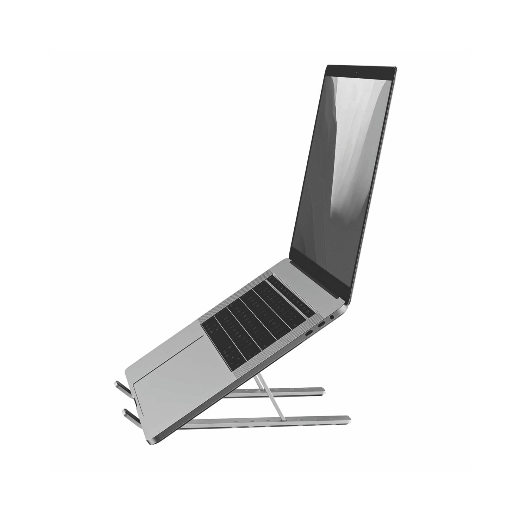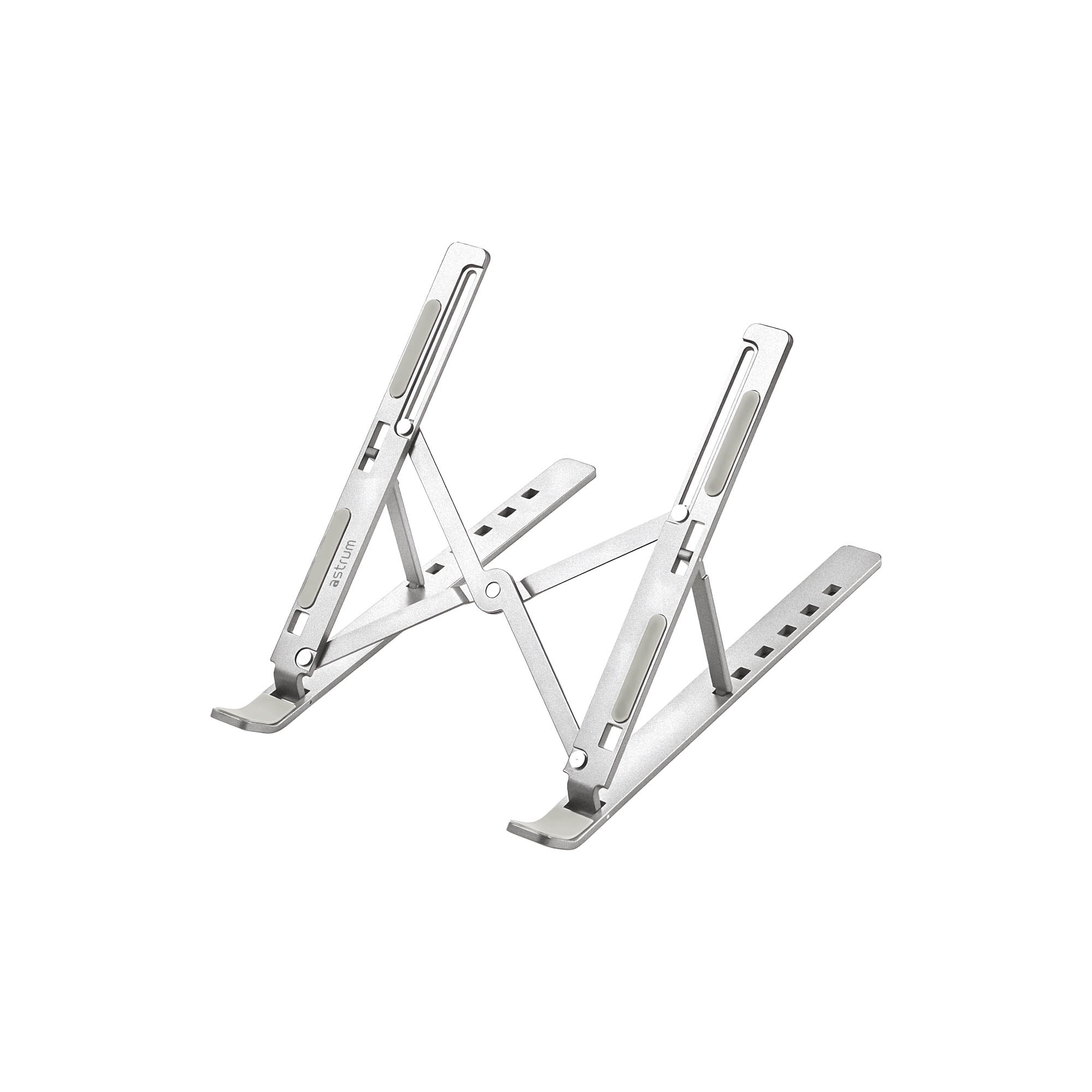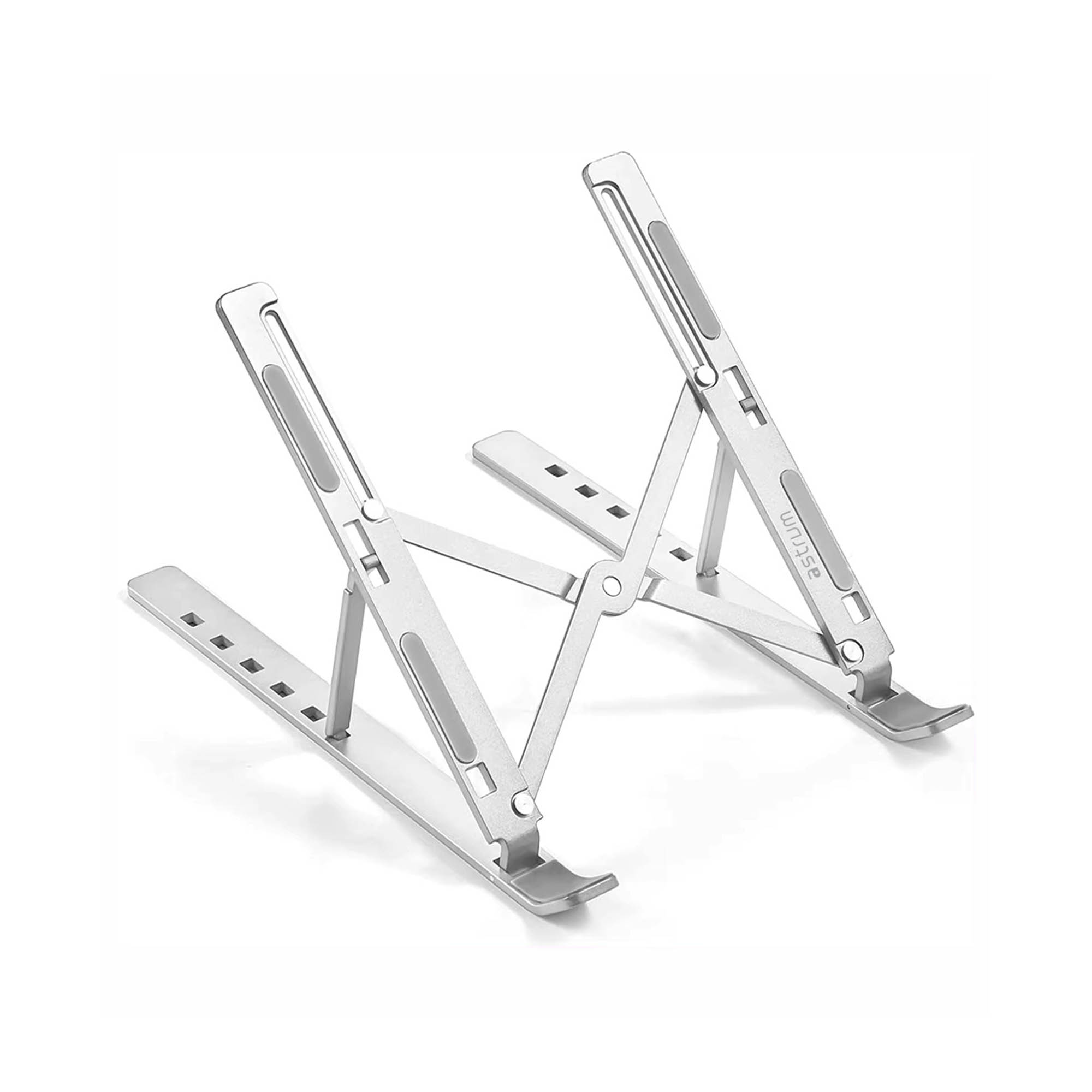 Foldable aluminum laptop/tablet stand with ultralight chassis, silicone cushions, feet, and expandable design.