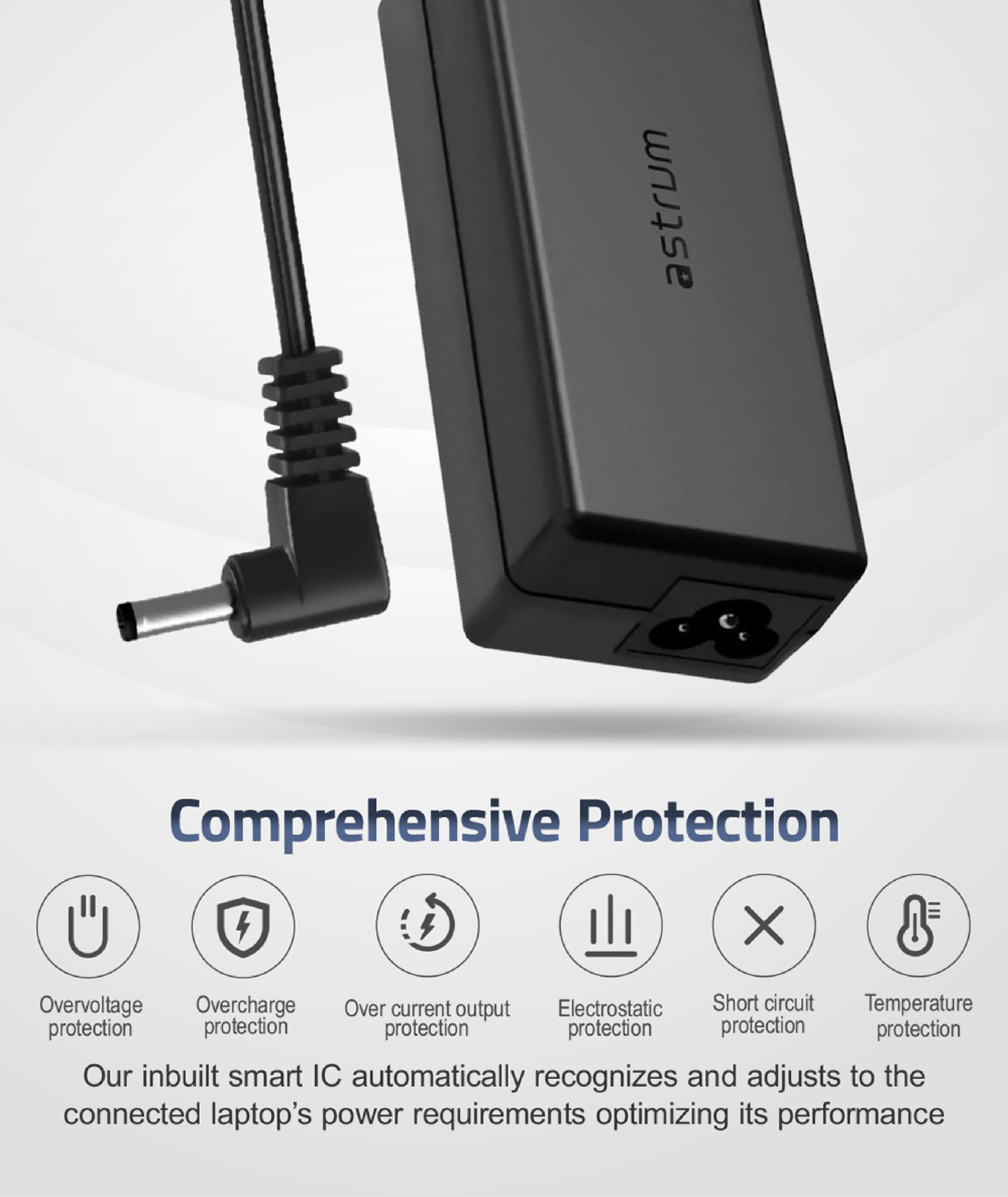 (Short Circut Output Protection) to safegaurd your laptop against potential hazards. - Smart IC Technology: Integrates Smart IC technology that automatically recognizes andadjusts to the connected laptop’s power