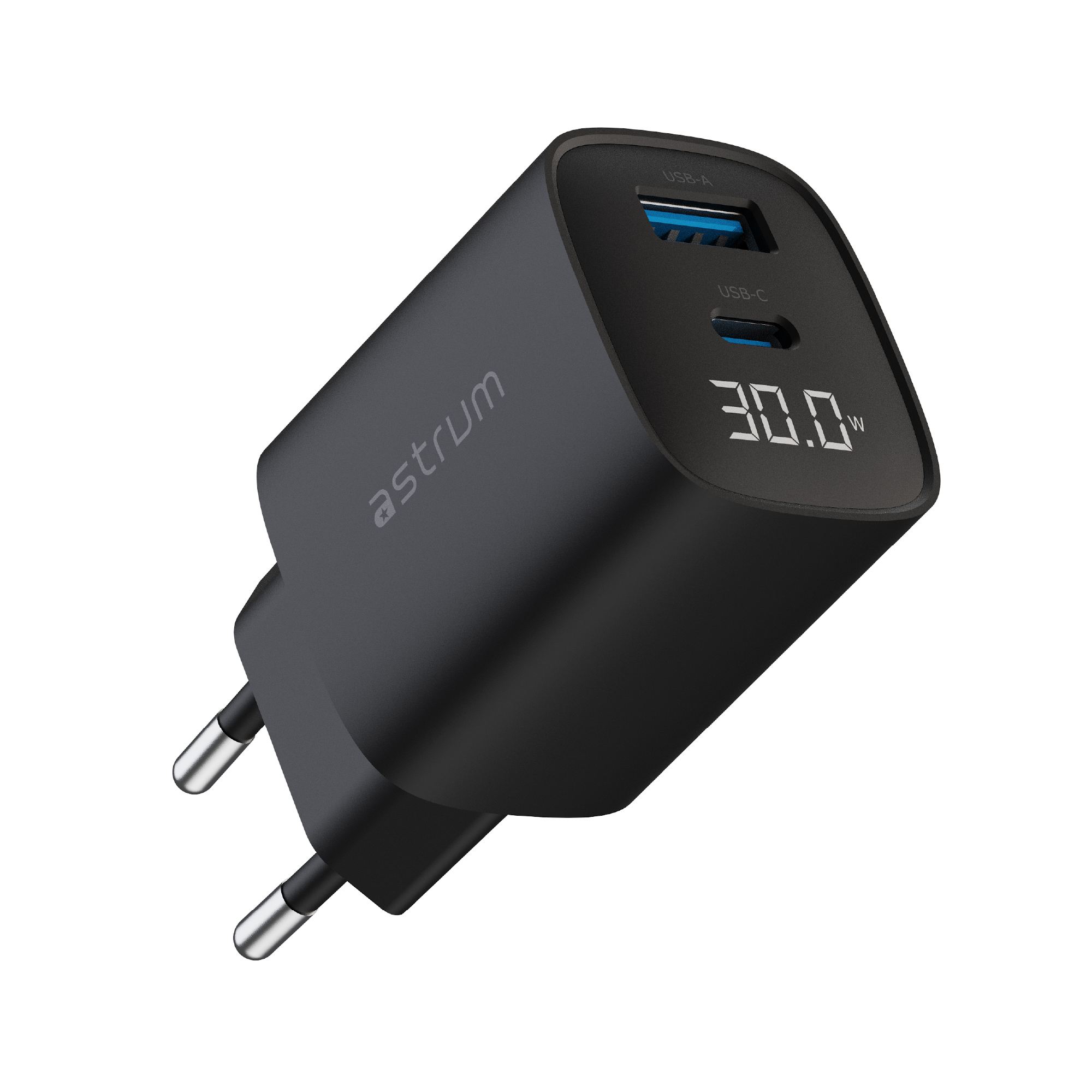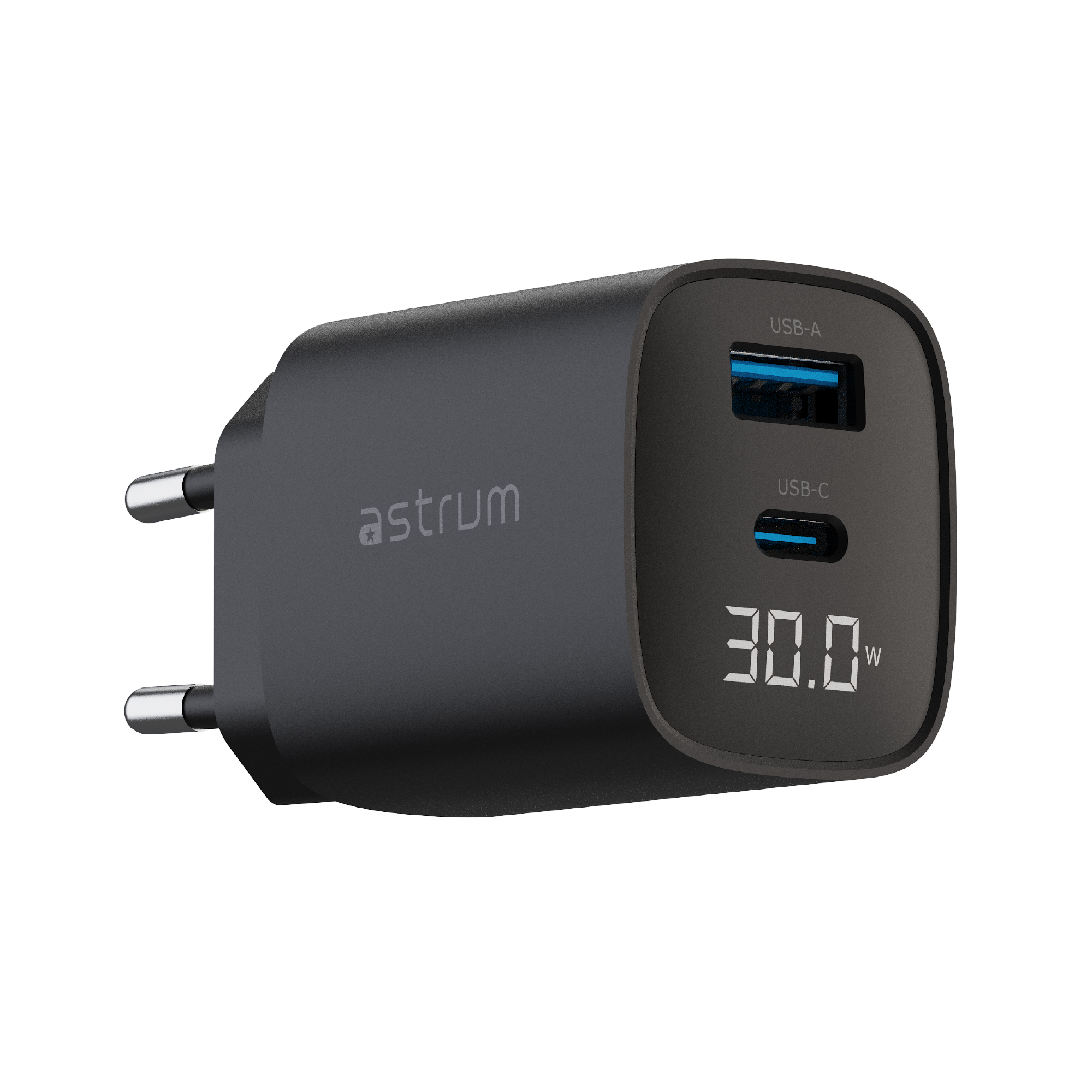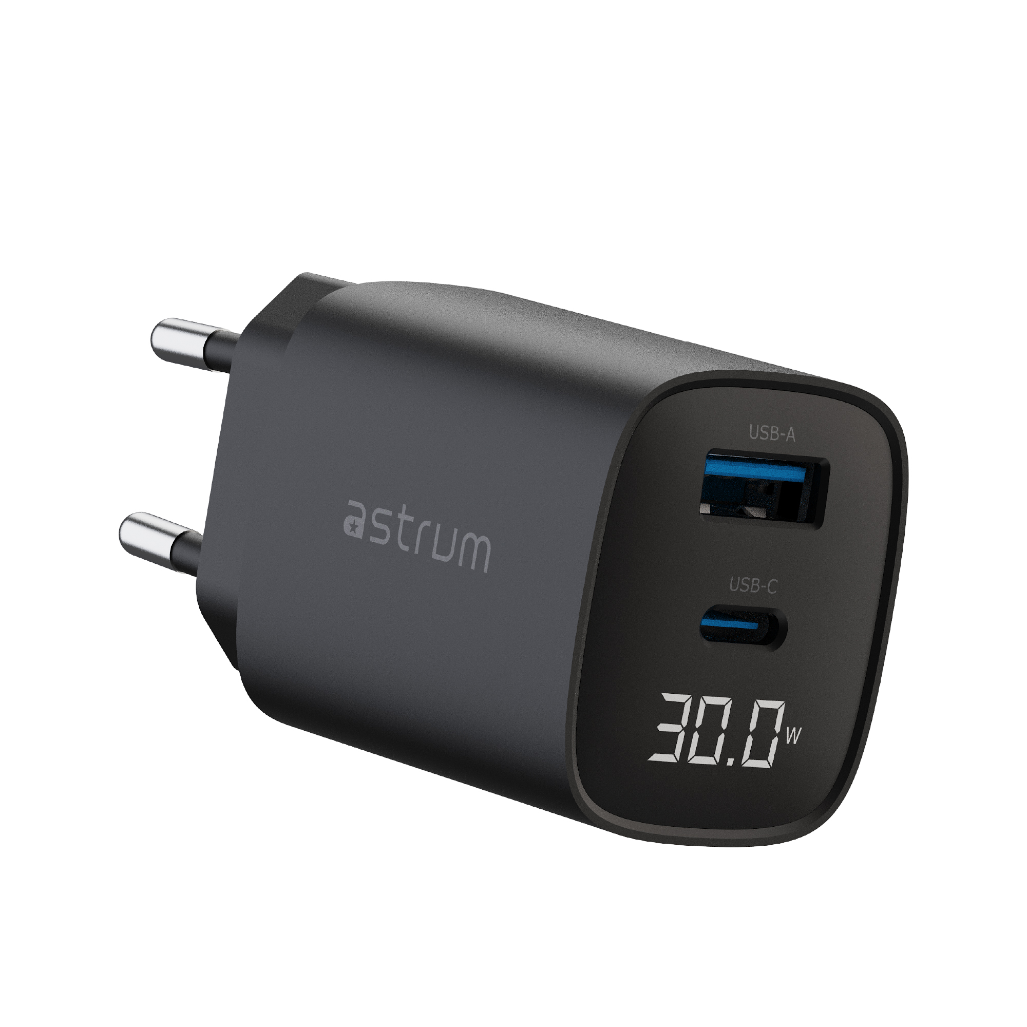 The Astrum WATZ30L is a powerful 30W wall charger designed for fast, safe, and versatile charging. Equipped with a USB-C PD port and a USB-A QC port, it supports simultaneous charging of multiple devices. The built-in LCD display provides real-time charging status, making it easy to monitor output power. Compact and travel-friendly, this charger is ideal for smartphones, tablets, and other USB-powered devices, delivering reliable performance wherever you go.