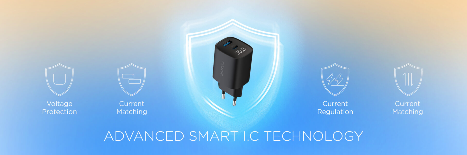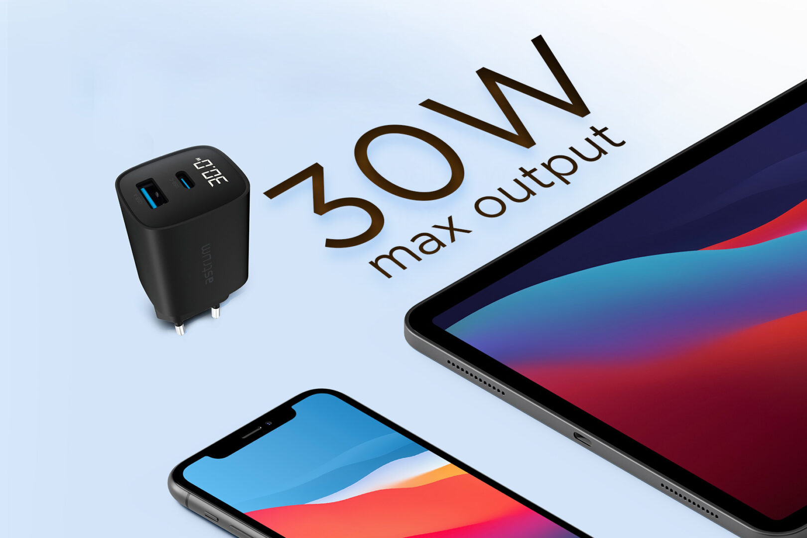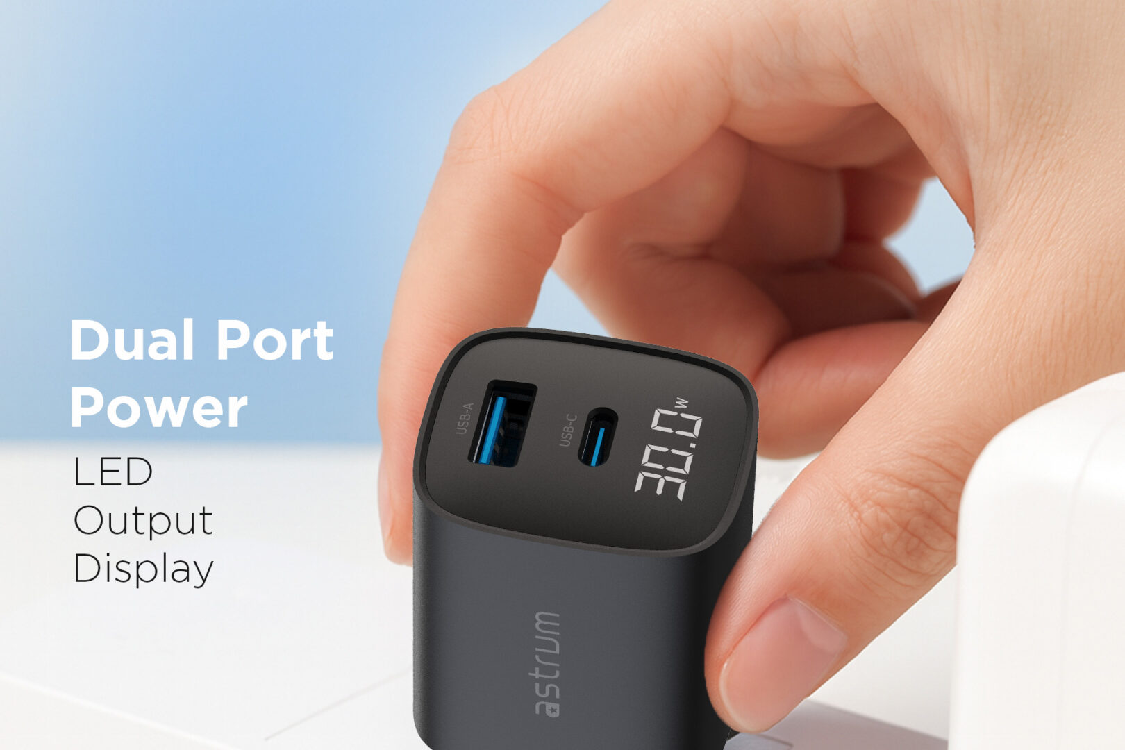 The Astrum WATZ30L is a powerful 30W wall charger designed for fast, safe, and versatile charging. Equipped with a USB-C PD port and a USB-A QC port, it supports simultaneous charging of multiple devices. The built-in LCD display provides real-time charging status, making it easy to monitor output power. Compact and travel-friendly, this charger is ideal for smartphones, tablets, and other USB-powered devices, delivering reliable performance wherever you go.